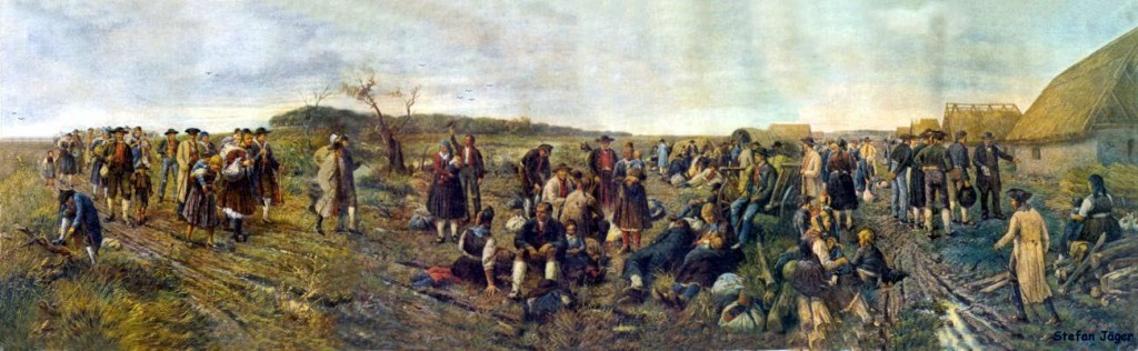 Die schwäbische Gemeinde Gertianosch im Banat, etwa 20 Kilometer westlich der Stadt Temeswar gelegen, veranstaltete zu Pfingsten des Jahres 1910 eine dreitägige „Gewerbe- und Bauernausstellung". Die landwirtschaftliche Messe war eine Veranstaltung von überregionaler Bedeutung, zu der zeitgenössischen Berichten zufolge an die 5.000 auswärtige Gäste strömten [1]. Einer der angekündigten Höhepunkte des Programms war die Enthüllung eines Gemäldes, das von den Gertianoscher und südungarischen Schwaben von Anfang an als ein Medium der kollektiven Erinnerung an die eigene Geschichte gedeutet wurde. Der Sekretär des "Südungarischen landwirtschaftlichen Bauernvereins" und Redakteur der Zeitung „Der Freimütige", Stefan Dold, führte in der anlässlich der Bildenthüllung herausgegebenen Festbroschüre aus: „Und heute am Enthüllungstage des Bildes stehen wir im Geiste vor den Ahnen. Wir wandern mit Weib und Kind zur Stätte hin, wo wir Dank und Ehre unseren Voreltern, den Bahnbrechern unseres heutigen Daseins darbringen und huldigen wollen. Ja, huldigen!" [2] Auch der Festredner bei der Enthüllung des Bildes, Domherr Franz Blaskovics, stellvertretender Obmann des Bauernvereins, nahm Bezug auf die Kolonistenahnen und erinnerte mit einem biblischen Vergleich an ihre Aufbauleistung im Banat: „Und jetzt wollen wir einen Blick auf die Vergangenheit werfen, als unsere Ahnen, so wie einst die Israeliten, durch die Wüste zogen [.„]. Damals war Ungarn auch noch nicht mit Milch und Honig gesegnet, sondern es waren überall noch die Spuren des 200jährigen Türkenjoches, Verwüstung, bemerkbar. Wenn wir uns die damaligen armseligen Lehmhütten betrachten und heute die modernen Bauernhäuser, so wie auch unsre Ausstellung, so gibt dies alles redliches Zeugnis von dem Fleiße des eingewanderten Volkes." [3] Die effektvoll in Szene gesetzte Präsentation verfehlte ihre Wirkung nicht, denn auch das Publikum war allem Anschein nach von dem Monumentalkunstwerk des jungen Banater Künstlers Stefan Jäger begeistert. Auf das der Öffentlichkeit präsentierte Werk wurde ein eigenes Loblied in der örtlichen Mundart von dem Volksdichter Josef Gabriel verfasst, der die Ansichten der Dorfbewohner mit einfachen Worten zum Ausdruck brachte: „Es werd ja heut ein scheenes Bild /Von ihrer Ankunft feierlich enthüllt./ Zu schaffe sin se komm her in des Land/ Un was die Ahne han b 'gonn mit fieiß 'ger Hand,/ Des han die Enkel treulich weiterg'führt. ! , Gesegnet sei ihr Staab, dem Ehr gebührt!'" [4]